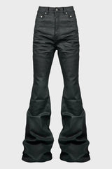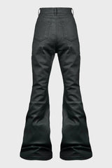 BOLAN BOOTCUT BLACK WAX from Rick Owens DRKSHDW AW25 Concordians. This bolan bootcut is a high waisted, slim fit 5 pocket jean with a floor-length boot cut. They close with a waist button and concealed button fly. They have a waistband with belt loops and pocket rivets and back patch pockets with topstitching.