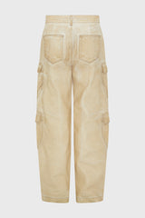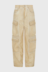Double cargo jeans in parchment 13oz foil denim from Rick Owens DRKSHDW ss25 Hollywood. These double cargo jeans are a full length 5-pocket jean with a low-rise and a loose fit. They have a concealed silver zip fly, belt loops and pocket rivets and they feature two beveled cargo pockets on the thigh, with two square cargo pockets below, and two square back pockets, all have flaps and topstitching.