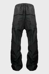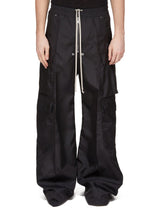 Double cargo jumbo belas in black nylon canvas from Rick Owens DRKSHDW FW25 Concordians. These double cargo jumbo bela pants are full-length with a low crotch and wide leg. They feature an elasticized waistband with drawstring and a bela exposed center zipper with two snap detail, and side welt pockets with rivets. They feature two beveled cargo pockets on the thigh, with two square cargo pockets below and two square back pockets. They all have flaps and topstitching.