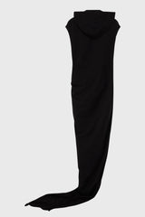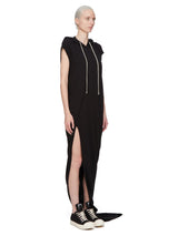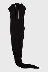 Edfu t dress in black medium weight cotton jersey from Rick Owens DRKSHDW SS25 Hollywood. This edfu t dress is long and trails floor length, with a square loose fit. It is sleeveless with wide square shoulders and level shoulder seams. It has a hood with a drawstring and features a skirt that slopes from a split high on the right thigh, and tapers into a long train. This mediumweight cotton jersey has a compact and dry handfeel. This jersey is garment dyed.