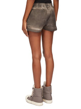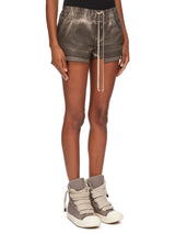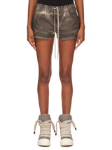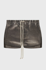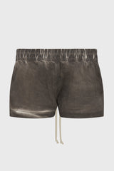 Fog boxers in darkdust overdyed foil stretch denim from Rick Owens DRKSHDW ss25 Hollywood. These fog boxers are cut high on the thigh. They have an elasticized waistband with drawstring, side welt pockets and side slits.
