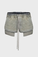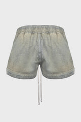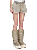 Fog boxers in 13oz mineral pearl denim from Rick Owens DRKSHDW FW25 Concordians. These fog boxers are cut high on the thigh. They have an elasticized waistband with drawstring, side welt pockets and side slits.