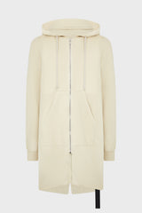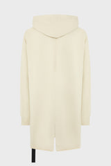 Hoodie fishtail parka in pearl furka heavy sweatshirt from Rick Owens DRKSHDWss24 lido. This hoodie fishtail parka is knee-length in front and dips to a longer length in back. It has a centre front zipper opening, a drawstring hood, long sleeves with rib cuffs, and front patch pockets. It features signature level shoulder seams and seam running down the centre back spine. This heavyweight cotton sweatshirt jersey has a soft and washed handfeel. This jersey is garment dyed.
