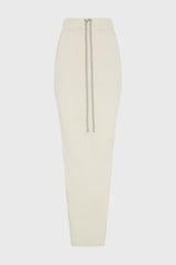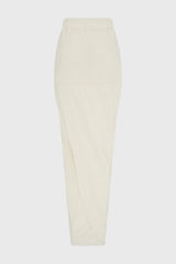 Pull on pillar skirt in natural compact cotton jersey from Rick Owens DRKSHDW ss25 Hollywood. from Rick Owens DRKSHDW ss24 lido. This pull on pillar skirt is full length at front and open to knee height at the rear. It has an elasticized waistband with drawstring and two side front pockets. The skirt wraps to the back, creating a centre back split opening and draping effect.