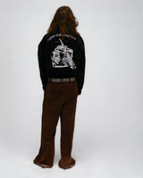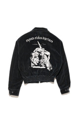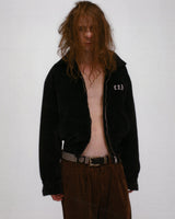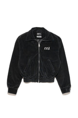 Zip-front jacket in japanese heavy cotton corduroy. Quilted poly-satin lining. Spread collar. Welt pockets at front and interior. Logo-branded metal zipper. Logo-engraved horn buttons at cuffs. Elastic at hem. Embroidered logo at front, artwork at back.