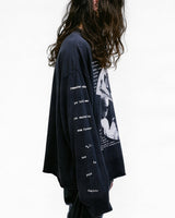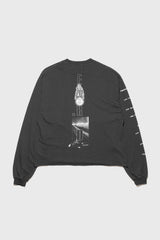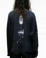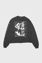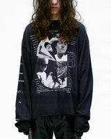 Long-sleeve t-shirt in heavy weight cotton jersey in faded black from Enfants Riches Déprimés. Boxy, cropped fit. Rib knit neckline and cuffs. Raw hem. Printed artwork at front, back, and right sleeve. Signature vintage wash process.