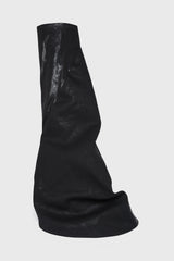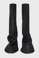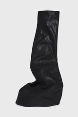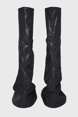 Fetish in black/milk/milk overdyed foil stretch denim from Rick Owens DRKSHDW ss25 Hollywood. These fetish sneaks are knee high. They have a boot shaped upper with an additional layer falling from an asymmetrical seam line, grazing the floor. They have milk toe caps and shark tooth soles.