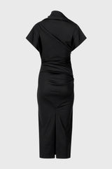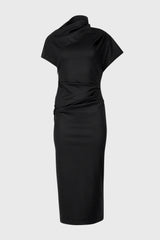 Flop dress in black from Entire Studios. It is a draped dress with pleat detailing, form fitted, midi length, back split and YKK invisible zipper.