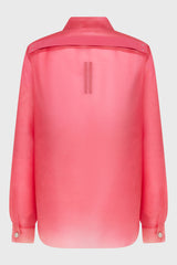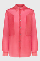 Fogpocket outershirt in hot pink transparent cow leather from Rick Owens. This fogpocket outershirt is below-hip length with a boxy fit. It has a center front opening with concealed snaps, a classic shirt collar, beveled side seams with splits, snap cuffs and double topstitching. It features two fog breast pockets with a vertical opening and internal snap, signature level shoulder seams and a cotton webbing strap with rivet detail on the back yoke.