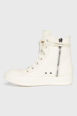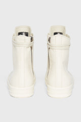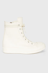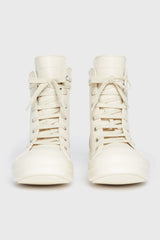 High top sneaks in milk/milk/milk washed calf from Rick Owens SS25 Hollywood runway. These sneakers are above-ankle height and feature seven eyelets, laces, a zipper on the inside ankle for easy fastening, toe caps and shark toothed bumper soles.