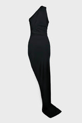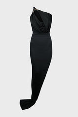 Hydra Aaliyah gown in black satin viscose jersey from Rick Owens Lilies FW25 Concordians. This hydra aaliyah gown trails floor length. It has an asymmetrical top, draping across the body to the right shoulder, with an opening, exposing the chest. It features a silver, 3 prong hydra hook clip, made from zinc and nickel free palladium, on the right shoulder. It drapes across the body, gathering into the left hip, and descends into a skirt with a high split that tapers to the floor.