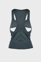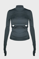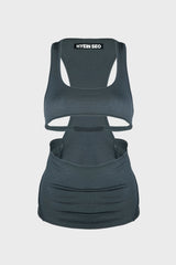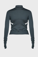 Double layer crop top in charcoal from Hyein Seo. Comes with a cutout racerback inner layer top and a cropped half high-neck long sleeve top, Can be styled together or separately, Glow-in-the-dark graphic printed on the left sleeve when worn, index finger holes on the sleeves.