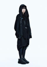 Hooded jakcet w/ graphic muffler in black from Hyein Seo. It is a hooded dolman-sleeve jacket, with detachable glow-in-the-dark graphic-printed muffler, logo rubber label detail for securing or loosening the muffler, button on the jacket collar for attaching the muffler.