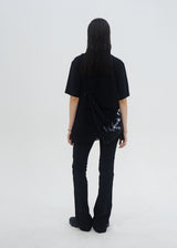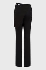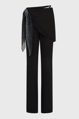 Semi-bootcut pants feature a detachable wrap skirt, highlighted by a scarf detail secured with a brass ring. The waistline is adjustable with an elastic drawstring.