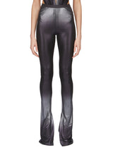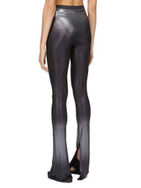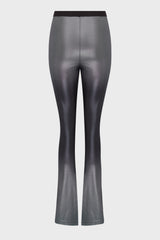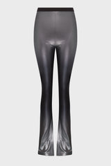 Carmen pants in degrade glossy viscose jersey from Rick Owens Lilies FW23 Luxor. These carmen pants are floor length. They have an elasticized waistband and a skin tight fit. They flare to a boot cut and have inner ankle seam splits. This mediumweight and fluid viscose jersey is stretchy and has a soft and glossy metallic degrade foil overlay.