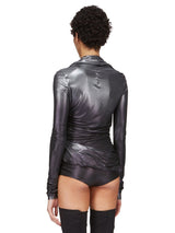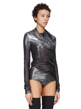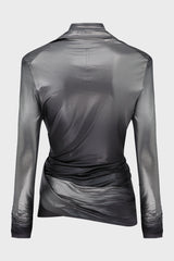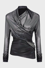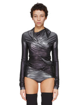 Easy magnetic ls top in silver degrade glossy viscose jersey from Rick Owens Lilies FW23 Luxor. This easy magnetic top is below hip length with long sleeves and a body hugging fit. It has a draped cowl neckline and multi-draping details creating a soft criss-cross effect across the centre front body. This mediumweight and fluid viscose jersey is stretchy and has a soft and glossy metallic degrade foil overlay.