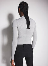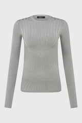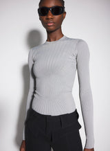 Sculpting knit top in grey from Mugler. It has long sleeves, round neck, fitted body and body sculpting effect.