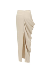 Asymmetric draped skirt in bone white from Oude Waag. This asymmetric draped skirt is made of Japanese acetate that is draped and matte finished. The asymmetric draping technique creates a natural cascading effect at the side, which can accentuate the waist and hip curves while elongating your legs for an elegantly relaxed look.