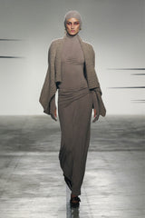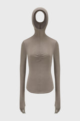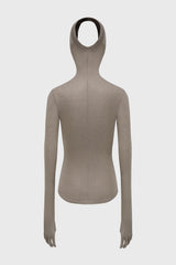 Gentle armour glove top in mineral grey from OUDE WAAG. This top is crafted from a lyocell–wool blend that is soft, breathable, and has plenty of stretch. this slim-fit top accentuates the upper body, while the hood cut-out allows hair to flow through for versatile styling and visual impact. Paired with detachable arm gloves, the design remains minimalist yet striking, exuding avant-garde sophistication.