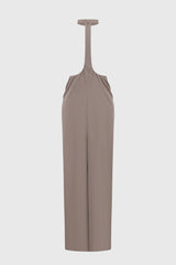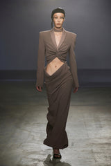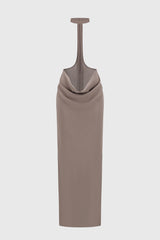 Halterneck draped skirt in mist grey from Oude Waag. Crafted from sustainably sourced Japanese triacetate fabric, this draped skirt features a smooth, flowing texture with a subtle matte finish. The halterneck design highlights the shoulder and neckline, offering a geometric elegance. The skirt drapes naturally, flattering the waist and hips while elongating the legs in an elegant, relaxed silhouette.