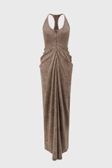 Knitted slim-fit draped dress from Oude Waag. This dress is crafted from lightweight stretch cotton-blend that feels soft and gentle against the skin. The scoop neckline extends into a low-cut open back, accentuating the elegant lines of the shoulders and neck. The fabric naturally cascades along the sides of the body, offering a flattering fit for a range of body shapes. A washed finish lends it a unique, worn-in texture and an effortless appeal.