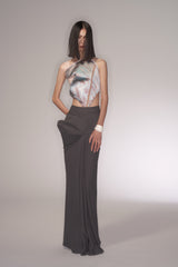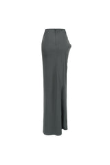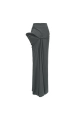 Soft shell draped skirt from Oude Waag. The soft shell draped skirt is made with a blend of rayon and cotton, creating a lightweight, soft, and elastic fabric. The iconic softshell design element is incorporated into the waist, enhancing the hip contour. The asymmetrically structured cutting technique allows the fabric to naturally stack and drape on the side.