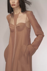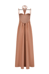 Shell pink soft shell halter dress from Oude Waag. The soft shell halter dress is made of a blend of wool and silk, giving the fabric a crisp texture. The matte surface adds a subtle and textured visual effect. The designer combines the brand's classic halter bodice with a backless dress, cleverly integrating the soft shell as a signature design element with the pockets.