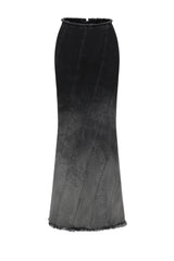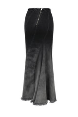 Washed stretch denim twisted skirt in black from Oude Waag. This washed stretch denim twisted skirt is made from stretch cotton-blend twill denim, featuring a high-quality EXCELLA cupronickel zipper. It is gentle on the skin, comfortable, and rich in texture. It is washed and finished with frayed edges to combine retro and contemporary glamor. The spiral panel flares out to a fishtail hem highlights the elegant lines of the lower body, showcasing a unique modern femininity.