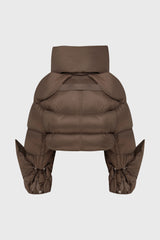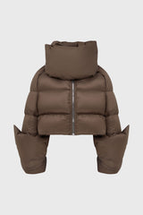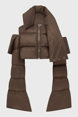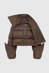 Babel mountain duvet cropped in dust recycled nylon from Rick Owens fw23 Luxor. This babel mountain cropped has a below the waist length with a centre front zip, a high funnel-neck collar with three snap closures that can be worn wrapped around or hanging open. It is a heavyweight duvet quilted with horizontal stitching lines. It has long sleeves with extra long cuffs that can be folded back. The raglan shoulder has three snap closures which can be undone and folded down to reveal shoulders, or enable the jacket to be worn as a vest with the sleeves hanging behind. It features a signature cotton webbing strap, with rivet detail, across the back yoke. It has two internal zippered pockets.