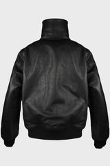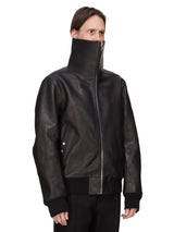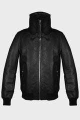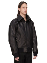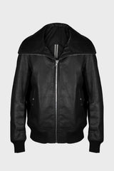 Blixa dracucollar in black washed calf leather from Rick Owens FW25 Concordians runway. This blixa dracucollar is hip length with long sleeves and a centre front zipper. It features an extended length collar that can be worn up or down and holds its shape thanks to it being reinforced with fusing material. It features two-snap pocket closure detail on side pockets, and has ribbed cuffs and waistband. It is fully lined and has two internal zippered pockets.