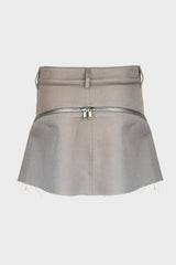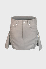Bolan Banana mini skirt in dust wool drill from Rick Owens AW25 Concordians. This bolan banana mini is a high waisted, slim fit 6-pocket jean skirt and fall high on the thigh. It has a waistband with belt loops and pocket rivets and close with a concealed button fly. It features a long zipper running from centre butt, curving around the hip to the skirt hem. It can unzipper at back to expose the butt and also up from the hem to expose more of the thigh.
