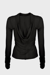 Cropped hooded rib longsleeve t in black viscose silk rib jersey from Rick Owens AW25 Concordians. This hooded rib ls t is cropped length with a slim fit and long sleeves. It has a ribbed round neck with a hood, raw cut hem and cuffs. It features the signature single seam running down centre back spine.