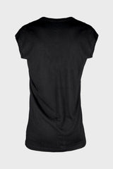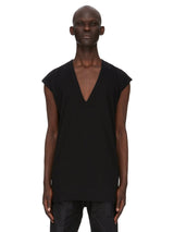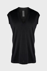 Deep v sl tee in black rainino jersey from Rick Owens AW25 Concordians. This deep v sl t is below-hip length, it has a deep v neck and wide shoulders with reinforced, raw cut, armholes. It features the signature single seam running down the center back spine.