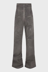 Dirt bolan in dark dust overdyed foil stretch denim from Rick Owens ss24 lido runway. This dirt bolan is a high waisted, slim fit, 5 pocket jean with a floor-length boot cut. They close with a waist button and concealed button fly. They have a waistband with belt loops and pocket rivets and back patch pockets with topstitching. This lightweight stretch denim is overdyed with a clear foil overlay that creates the waxy touch.