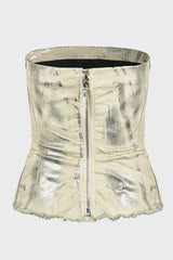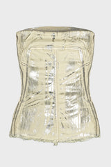 Bustier top in palladium foil stretch denim from Rick Owens DRKSHDW FW25 Concordians. This bustier top is hip length with a close to the body fit. Its strapless bustier top has a signature geo seam running across the front chest and slanting diagonally down the side body. It has a centre back zipper and raw cut hem.