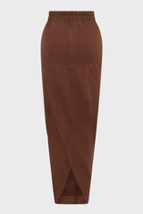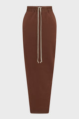 Pull on pillar skirt in terra compact cotton jersey from Rick Owens DRKSHDW FW24 Porterville. from Rick Owens DRKSHDW ss24 lido. This pull on pillar skirt is full length at front and open to knee height at the rear. It has an elasticized waistband with drawstring and two side front pockets. The skirt wraps to the back, creating a centre back split opening and draping effect.