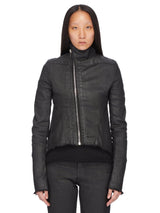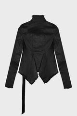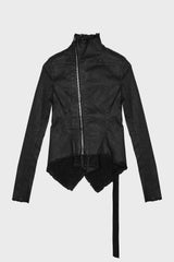 Naska gary jkt in black wax stretch denim from Rick Owens DRKSHDW FW25 Concordians. This naska gary jacket is below waist length with a skin tight fit. It has long sleeves, a high neck with an asymmetrical zip front opening and level shoulder seams with topstitching. It features a curved naska hemline that dips into two points at the back and has raw cut hems and edges.