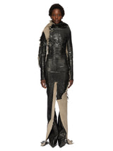 Etna dress in black/natural black megacrust stretch denim and natural stretch denim from Rick Owens FW25 Concordians runway. This Etna dress is floor length at the sides with a close to the body fit. It features a wide, high draped neck at front, that widens into an open back neck, and has a zipper down to the butt. It has long, fitted sleeves and features two high slits front and back as well as a front and back stitch ridge detail.