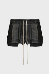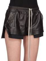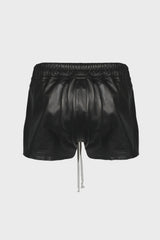 Fog boxers in black waxy lamb leather from Rick Owens AW25 Concordians. These fog boxers are cut high on the thigh. They have an elasticized waistband with drawstring, side welt pockets and side slits. They feature visible pocket bags that hang below the hem of the boxers.
