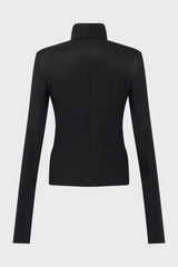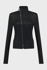 Gary Jkt in black vegan stretch lamb leather from Rick Owens. This Gary jacket is below waist length with a skin tight fit. It has long sleeves, a high neck with an asymmetrical zip front opening and level shoulder seams with topstitching.