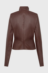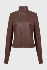 Gary Jkt in throat coated stretch denim from Rick Owens FW24 Porterville. This Gary jacket is below waist length with a skin tight fit. It has long sleeves, a high neck with an asymmetrical zip front opening and level shoulder seams with topstitching.