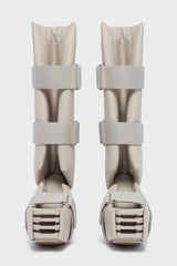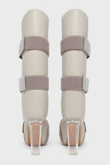 Hi splint kiss in pearl/clear peached lamb skin from Rick Owens ss24 lido runway. These hi splint kiss are below-knee height. They have a rigid foam outer that wraps the sides of the foot and around the back leg and ankle. They secure in place with adjustable webbing straps. They are an open front sandal and feature an internal platform and a high transparent plexi heel. This lightweight lamb leather has a soft and natural handfeel achieved by tumbling the skins multiple times in a large drum.