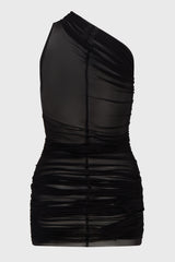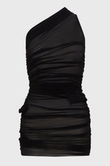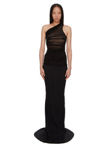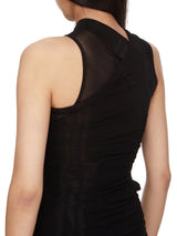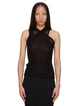 Hollywood banana t in black stretch cupro jersey from Rick Owens ss25 Hollywood runway. This Hollywood banana t is above-hip length and sleeveless. It has an under layer with two round holes with ribbed edges, and an outer layer that folds up to create a criss-cross draped neck front and back.