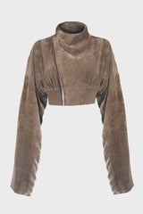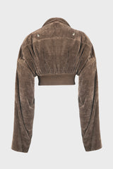 Hollywood cropped flight in darkdust velvet from Rick Owens FW25 Concordians. This hollywood cropped flight is above-waist length with long, wide sleeves. It has a concealed front zipper sloping from the centre hem to the right side of the neck and top snap. It features a tight ribbed waistband, draping effect front and back and two snap detail on back yoke.