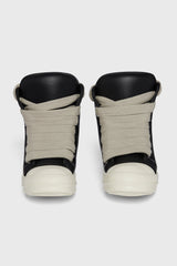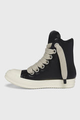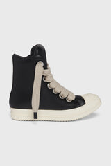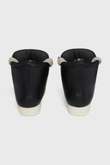 Jumbo laced padded sneaks in black/milk/milk peached lamb skin from Rick Owens FW24 Porterville. These jumbolaced padded sneaks are above-ankle height and feature eyelets, jumbo laces, toe caps and shark toothed bumper soles.