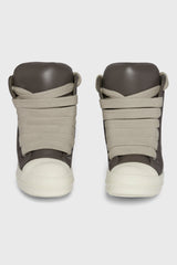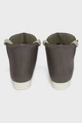 Jumbo laced padded sneaks in dust/milk/milk peached lamb skin from Rick Owens FW24 Porterville. These jumbolaced padded sneaks are above-ankle height and feature eyelets, jumbo laces, toe caps and shark toothed bumper soles.