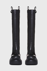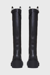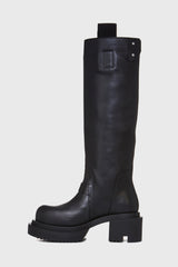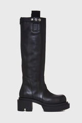 Pull on bogun in black/black washed calf from Rick Owens. These pull on bogun are mid-calf height. They have a pull on boot upper, a topstitched seam arching over the front foot and a stitched heel counter. They have a back pull tab and a rounded toe. They feature a bogun rubber mega creeper sole with a toothed square heel.