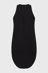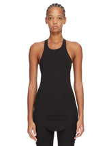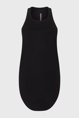 Basic tank in black compact stretch jersey from Rick Owens Lilies ss25 Hollywood. This basic tank is hip length with a rounded raw cut hem that dips in front and back. It has a round neckline and thin shoulder straps that flow into a slight racer back. It features the signature single seam running down the centre back spine. This heavyweight stretch jersey is compact with a dry handfeel.