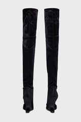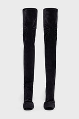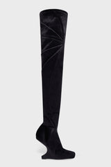 Cantilever 11 thigh high boot in black velvet jersey from Rick Owens Lilies FW23 Luxor. This cantilever 11 thigh high boot is a high cantilevered heel boot with a tight stretch, thigh high, sock and a square, slightly open toe. This version has seamed panels that follow the curves of the leg, meeting with radiant seam lines. This mediumweight velvet jersey is fluid and has a soft velvety handfeel.