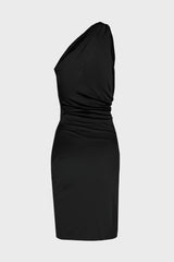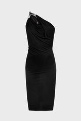 Hydra Aaliyah mini in black satin viscose jersey from Rick Owens Lilies AW25 Concordians. This hydra aaliyah mini dress has above-the-knee length. It has an asymmetrical top, draping across the body to the right shoulder, with an opening, exposing the chest. It features a silver, 3 prong hydra hook clip, made from zinc and nickel free palladium, on the right shoulder. It drapes across the body, gathering into the left hip, and descends into a skirt with a high split that tapers to the floor.